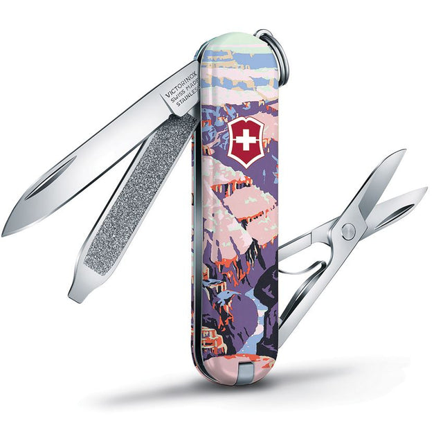 Model/Item/Part Number - VN55494. Swiss Army Classic Knife Grand Canyon National Park Handles. 2.25" (5.72cm) closed. ABS handle. Tools include: Small blade l Scissors l File l Keyring l Screwdriver tip l Toothpick l Tweezers. Grand Canyon National Park handle artwork. Hang packaged. Made in Switzerland.