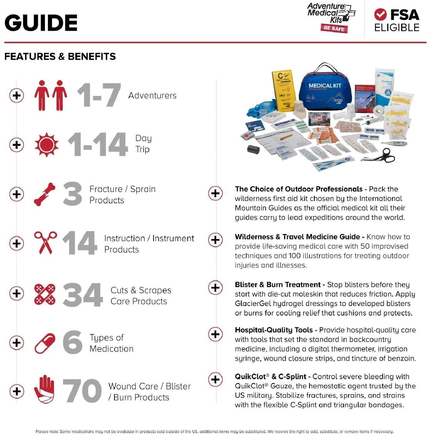 - Includes multiple doses of common medications to keep you going on longer trips, including medications for allergic reactions, itches, pain, fever, inflammation and diarrhea