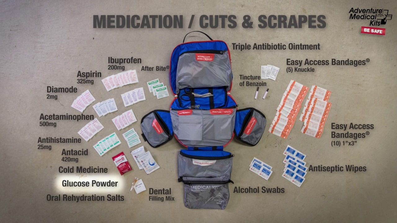 - Also includes glucose powder for insulin shock, oral rehydration salts for severe dehydration, and emergency dental repair gear for lost or loose fillings or crowns