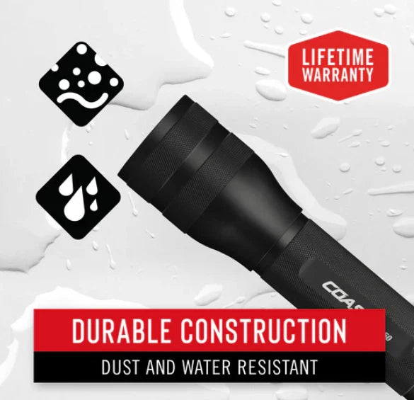 This Coast Pure Beam Focus Flashlight is a high-powered tool that will illuminate your path in the dark. With a range beam distance of 918 ft, it is perfect for camping and hiking. The flashlight is made of durable materials such as ABS, aluminum, and metal, and it is waterproof, making it suitable for all weather conditions.
