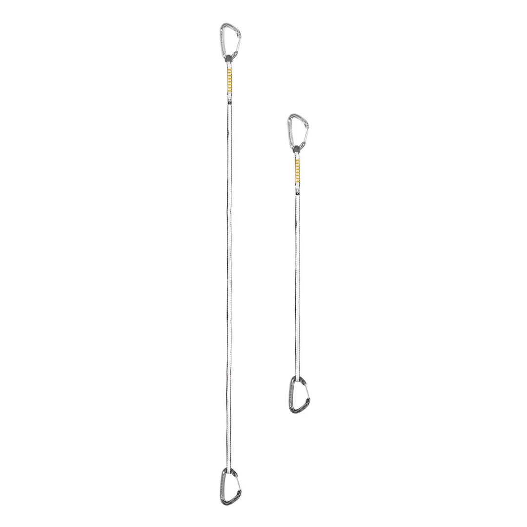 With its ultra-lightweight dyneema webbing and Plum carabiners, the Express provides exceptional strength while maintaining a low weight. The freeze-thaw resistance of the wire locks and the elastic band that stabilizes the bottom carabiner when attaching the rope mean that the Express is ready for any challenge. The 60 cm length of the webbing is ideal for mountain routes with a confusing route, while giving you the option to shorten it by folding the webbing. This prevents the rope from stiffening when leading.