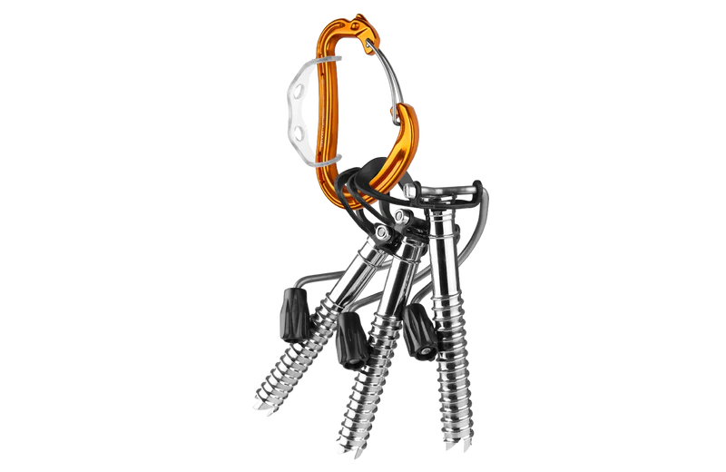 It is a "2 in 1" product: a great carabiner, but at the same time it has been specially designed to be also used as a screw/gear carrier on the harness. It has two lumps on the body: one to better fix in on the harness, and the orther one to place the screws wile picking them. It comes with a rubber strip to help fix it on any harness. Individually tested, with the date of testing and progressive number laser-marked on it.