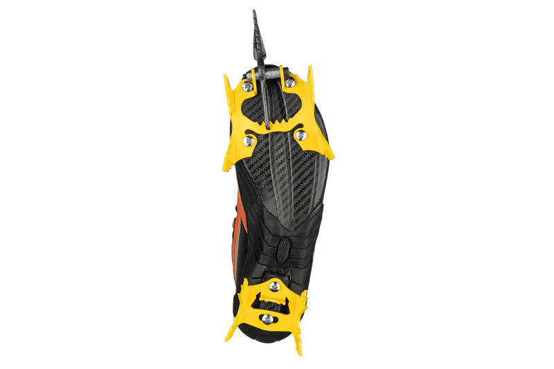 Racing is used by experienced climbers during races in particular. Usable both on ice and on rock, the pieces have to be mounted directly on climbing boots. It has a forged steel front point, replaceable in case of wear. The forging allows a three-dimensional shape to improve both the penetration into the ice, without rebounds, and the support.
