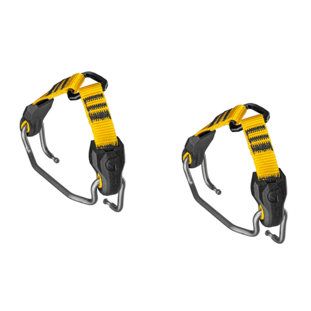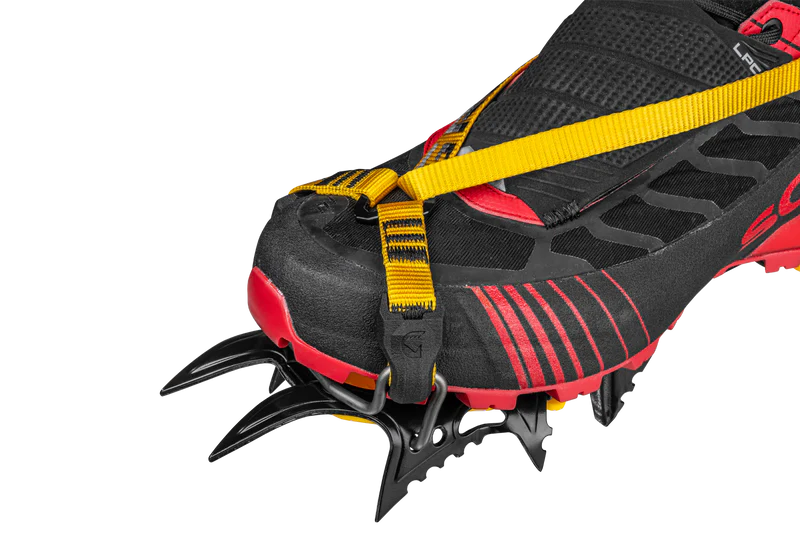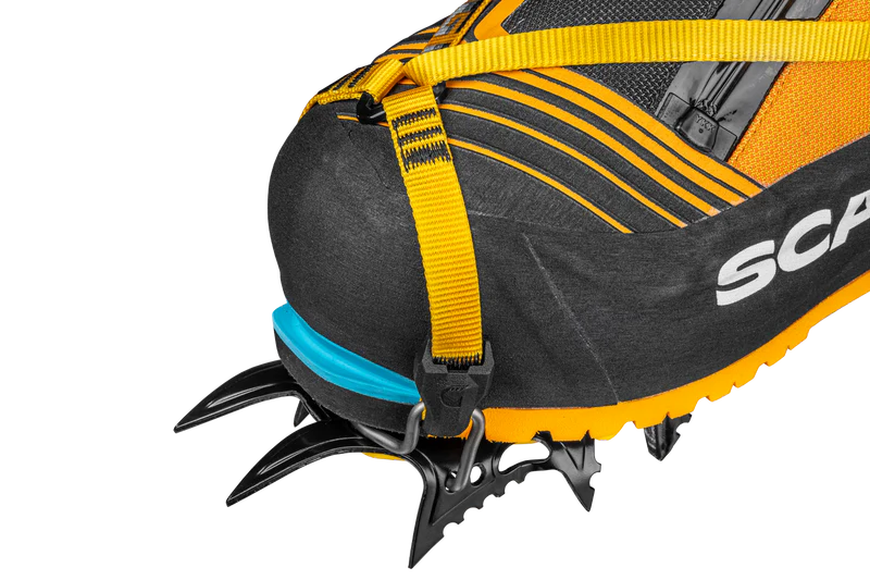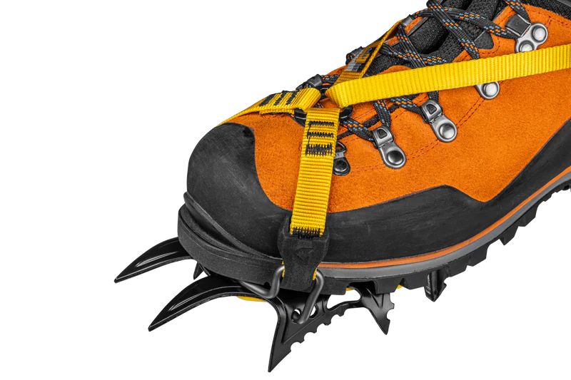 Front bail that allows you to adapt Grivel Cramp-O-Matic crampons to mountaineering boots that don’t have toe welts.